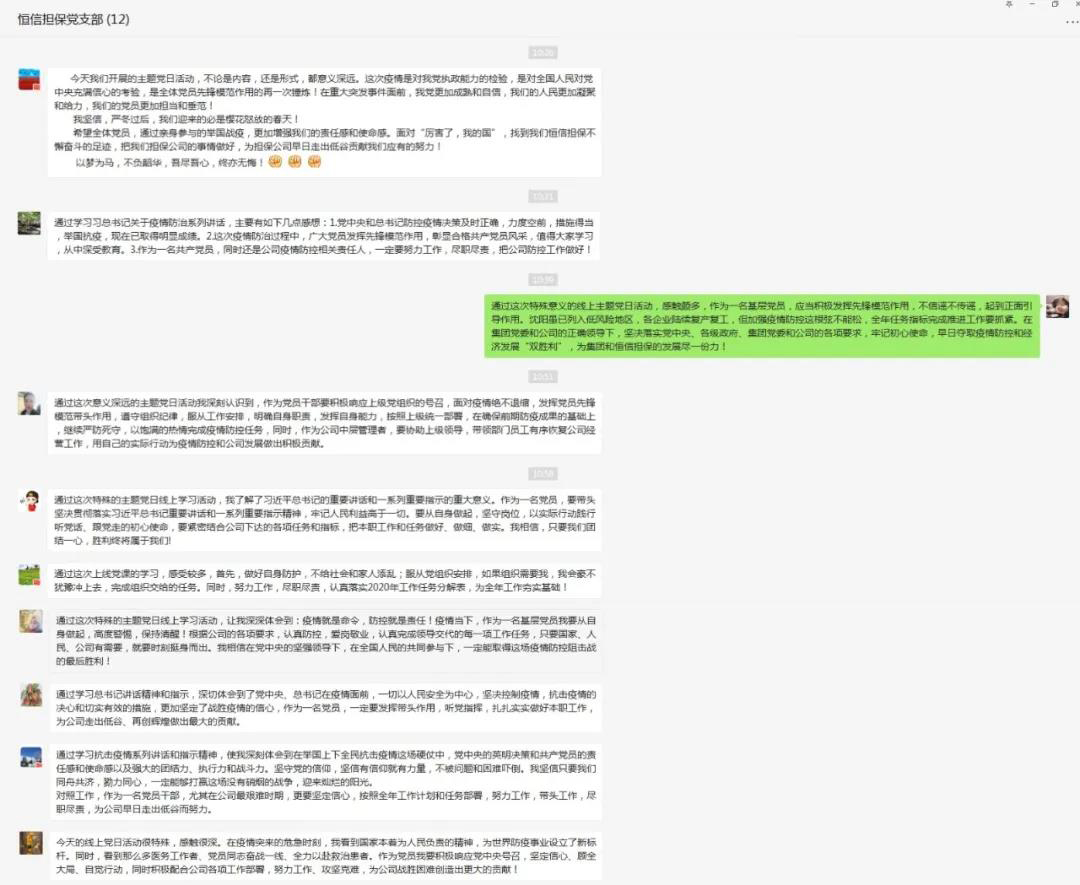 在疫情防控要害时期,恒信担保党支部坚持疫情防控不松开,党员学习不中止,团结公司现实,通过党支部微信群转达学习习近平总书记关于新型冠状病毒肺炎疫情防控系列主要讲话精神,党员们在各自工位自觉学习《习近平总书记关于新型冠状病毒肺炎疫情防控系列主要讲话、指示汇编》。线上讨论历程中,各人纷纷讲话,总结心得收获。